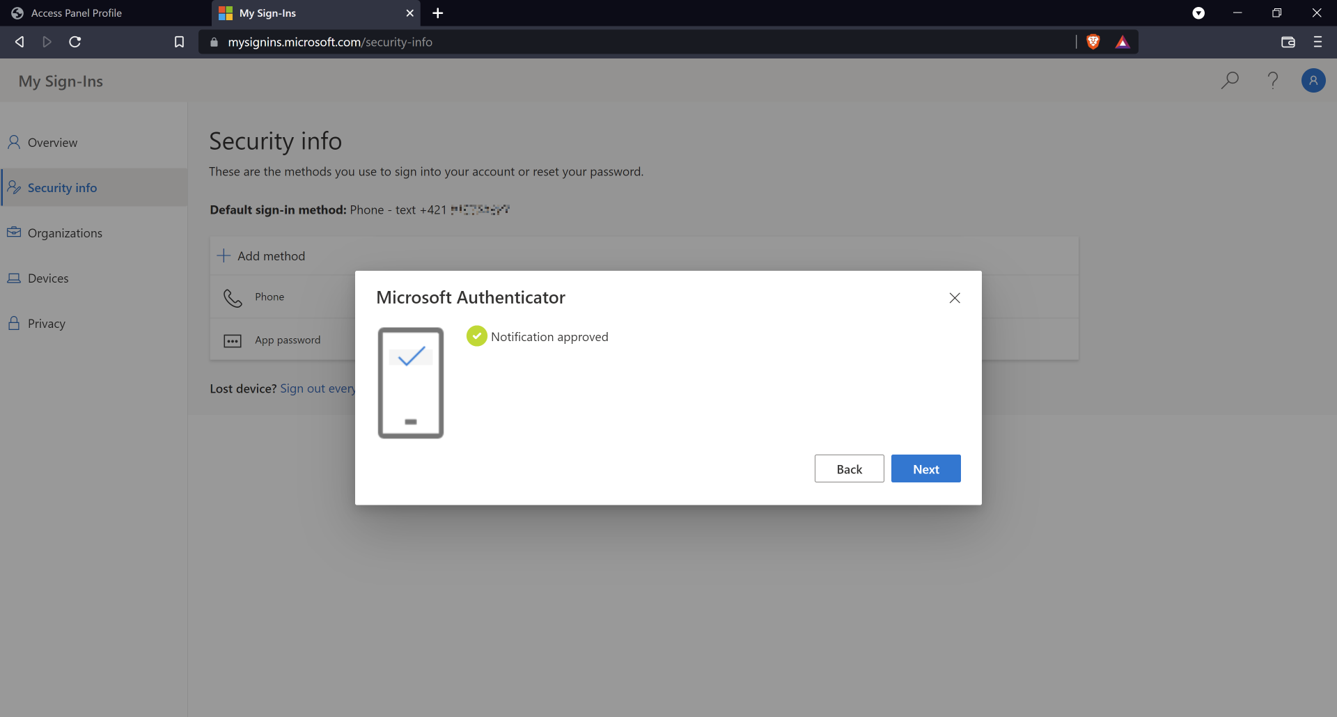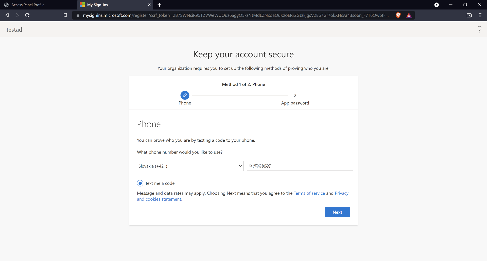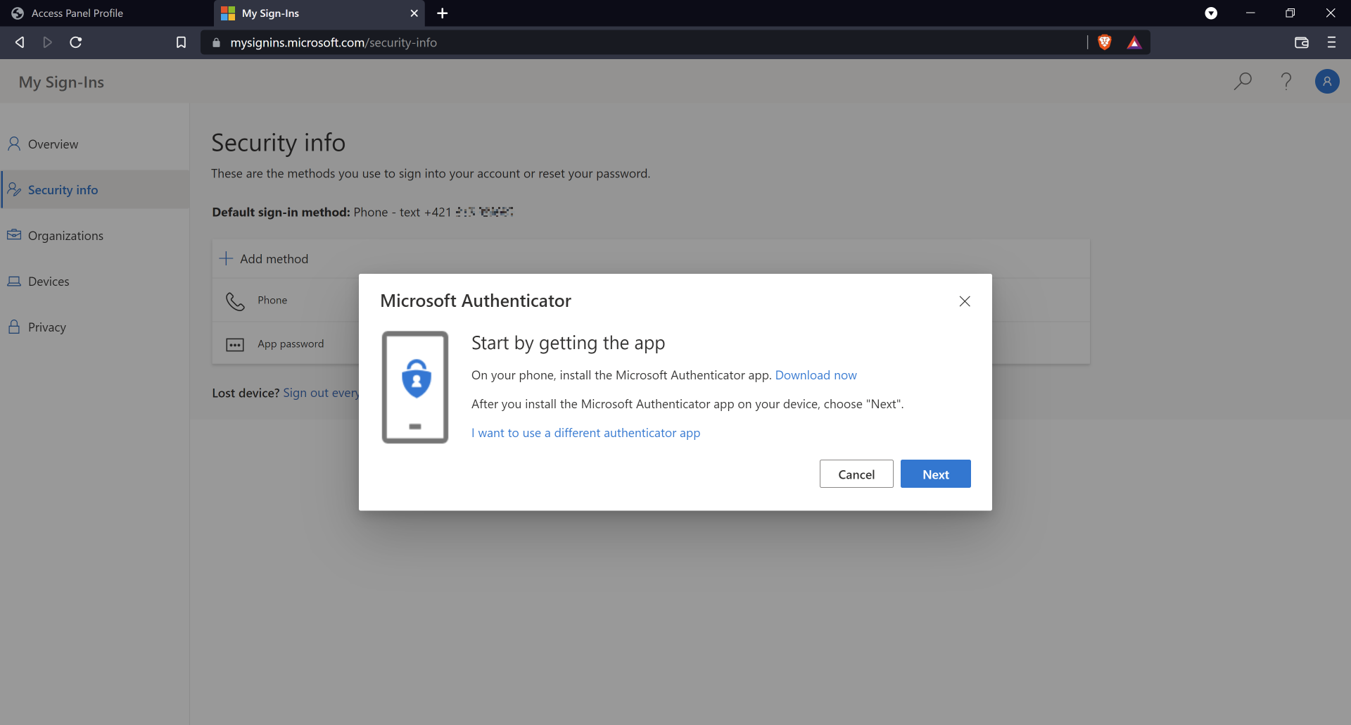 If MFA on your account is enabled, you need to validate it by the next factor. Since MS Authenticator is not yet active, you have to authenticate by SMS Click Next