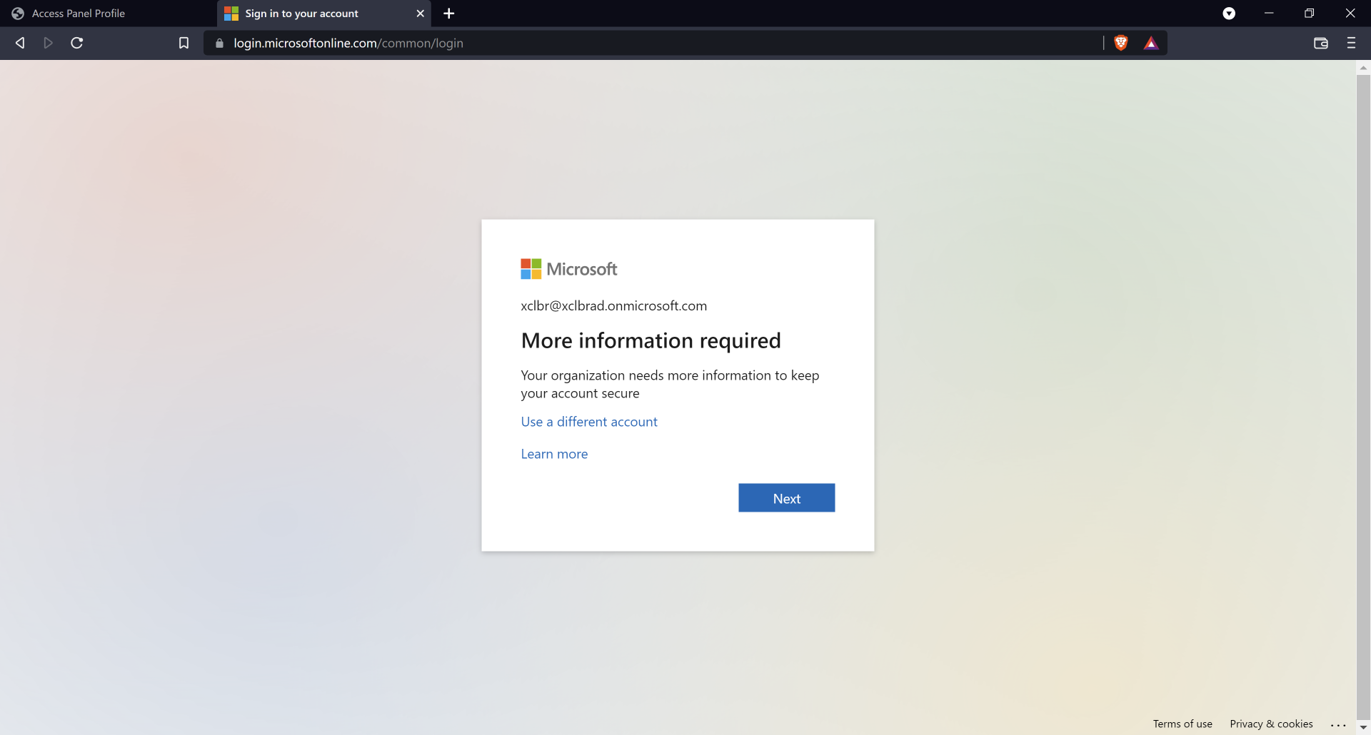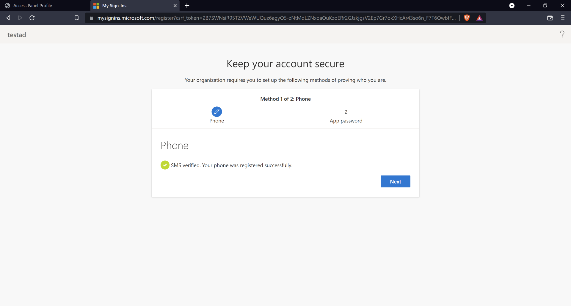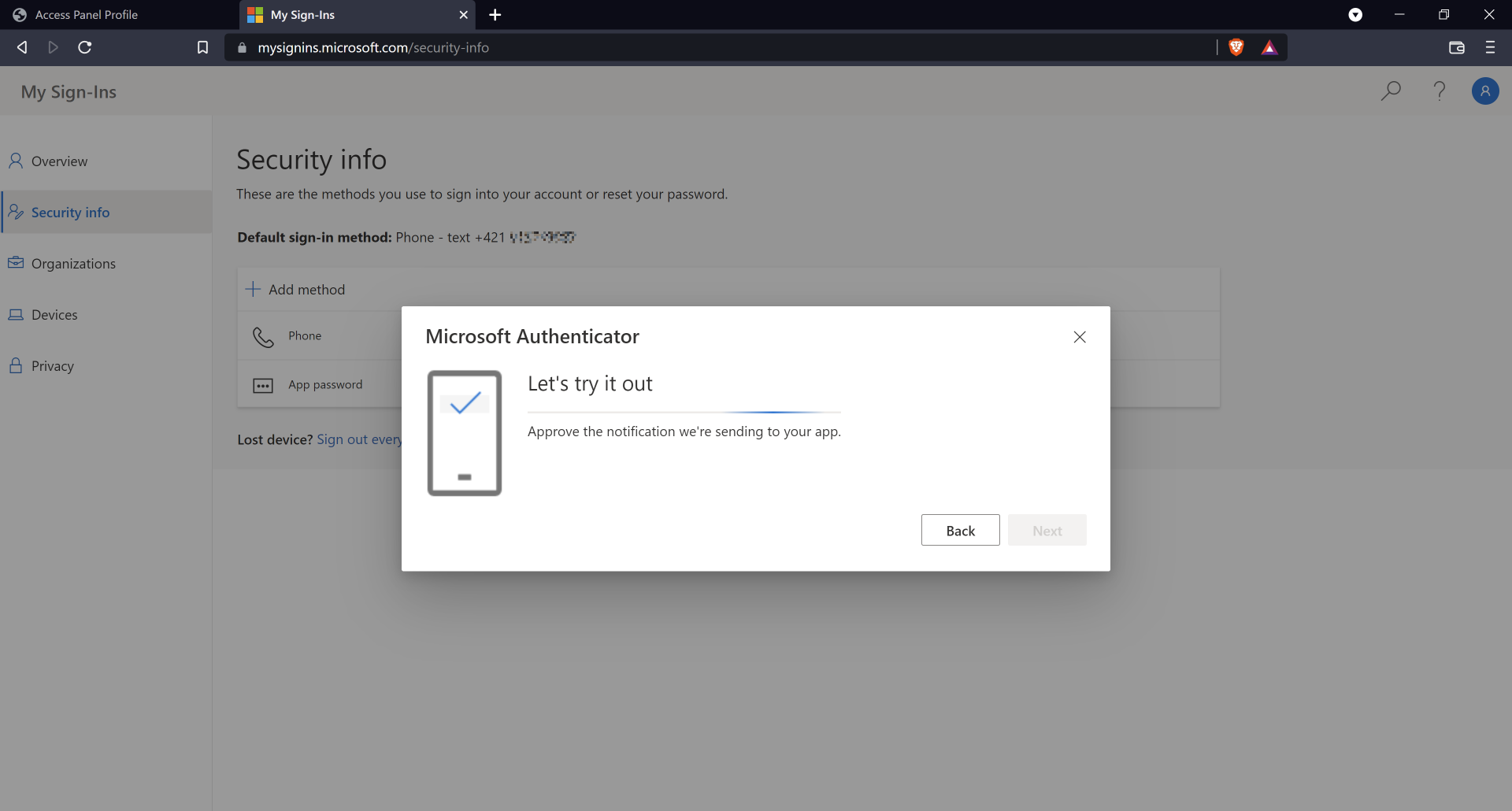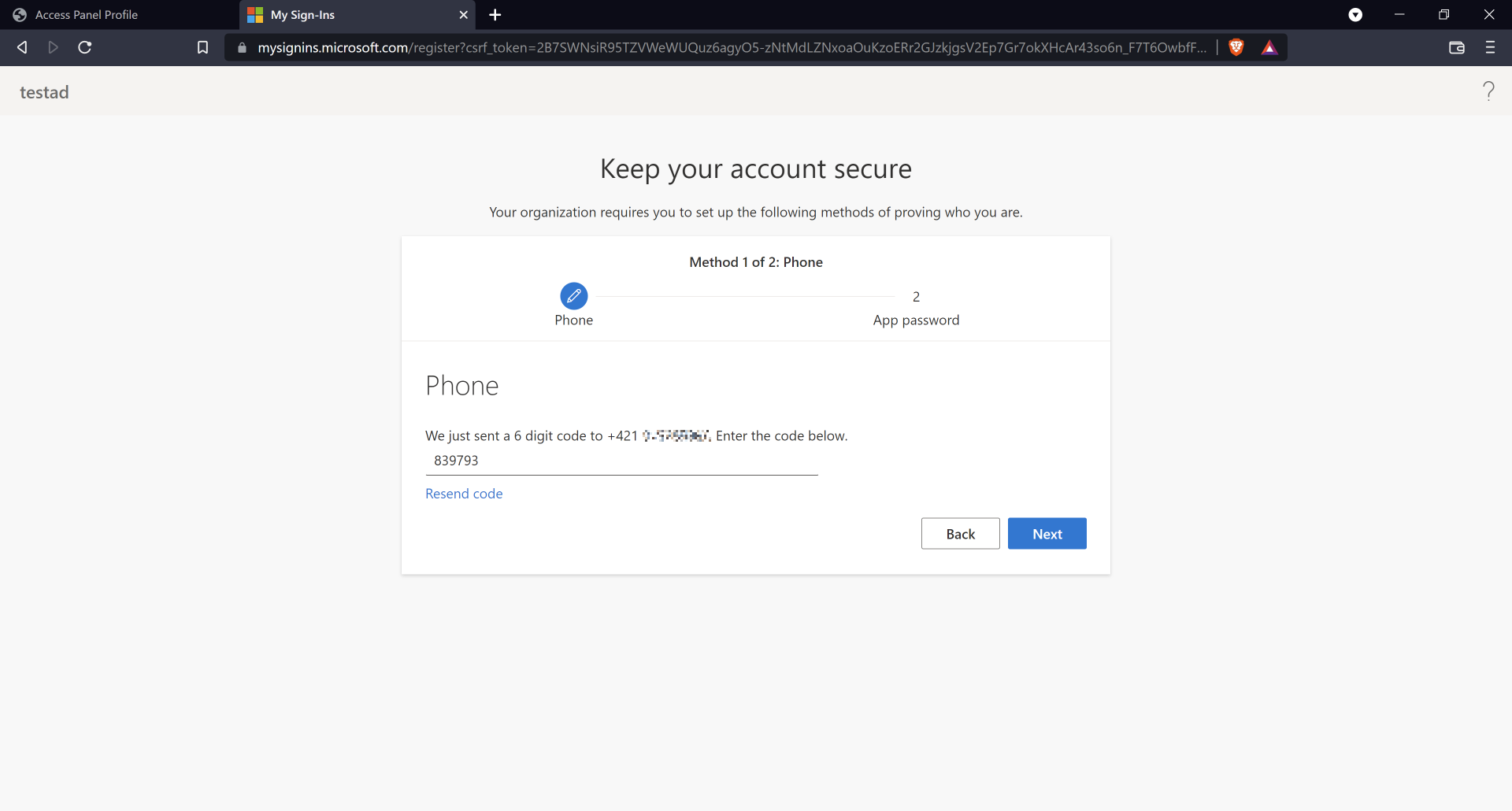 If MFA on your account is enabled, you need to validate it by the next factor. Since MS Authenticator is not yet active, you have to authenticate by SMS Click Next