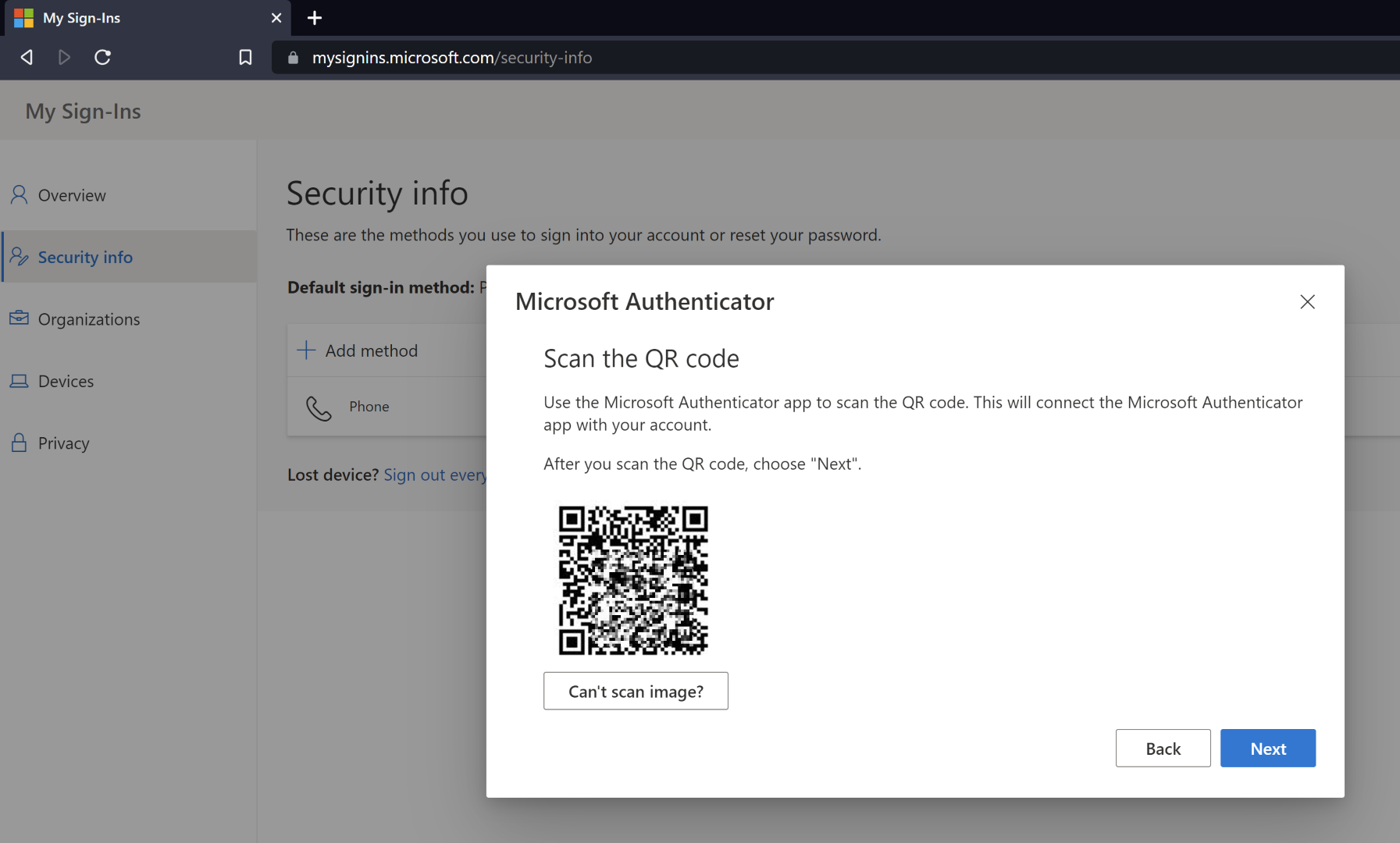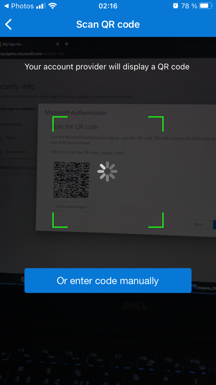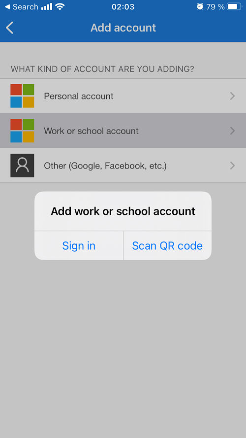 Now open the MS Authenticator app on your phone, add a new account and select Work or school account. Tap Scan QR code