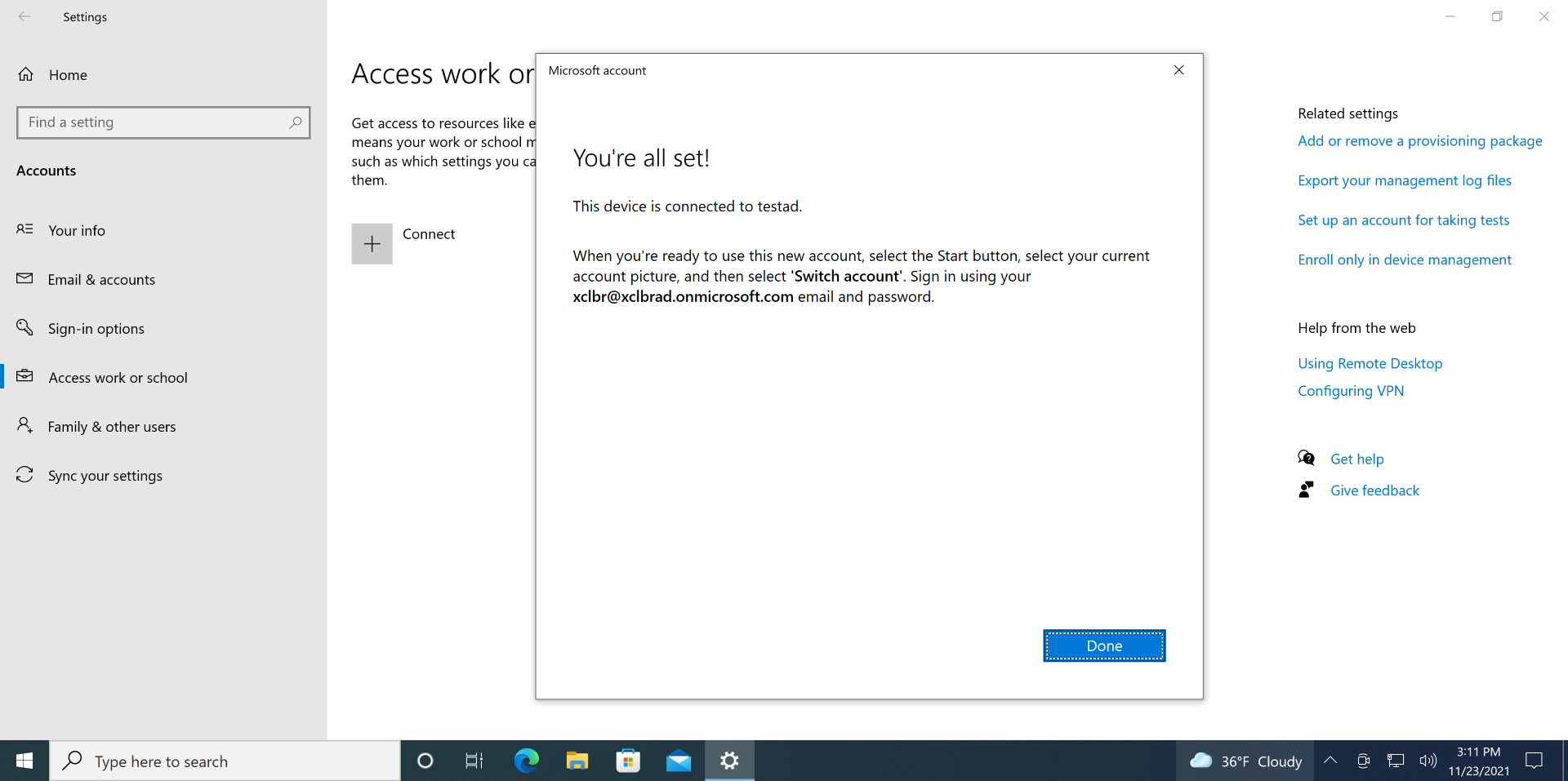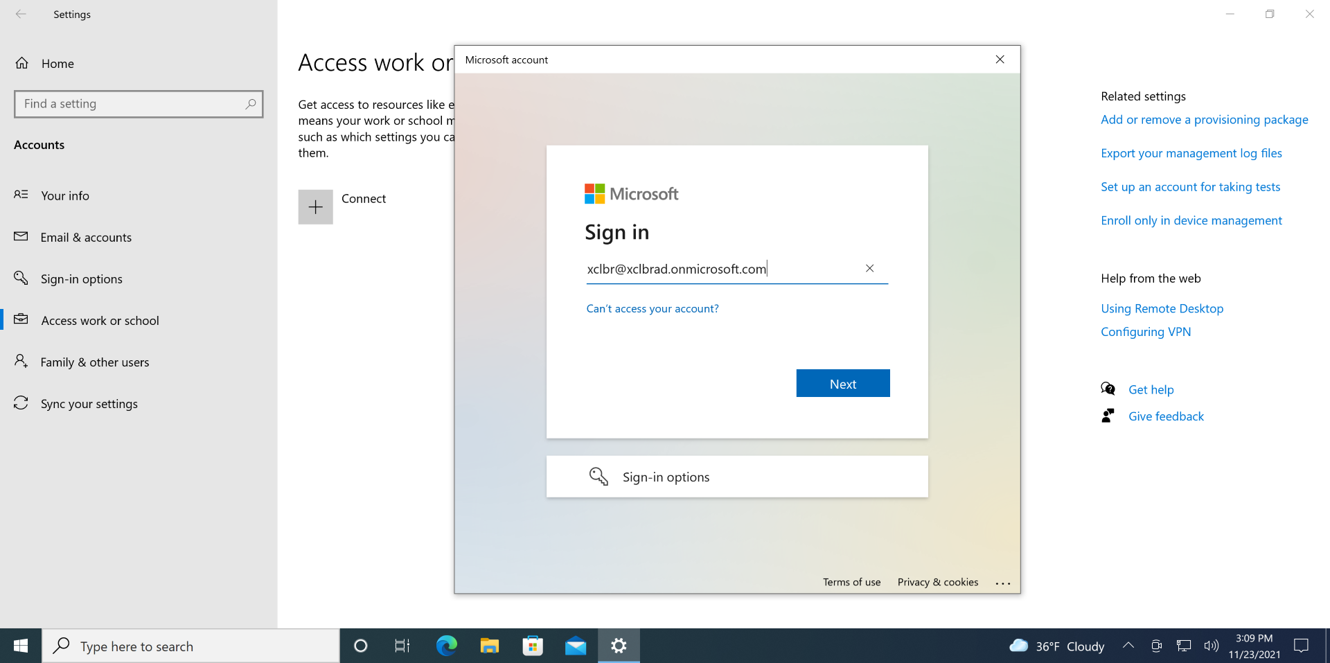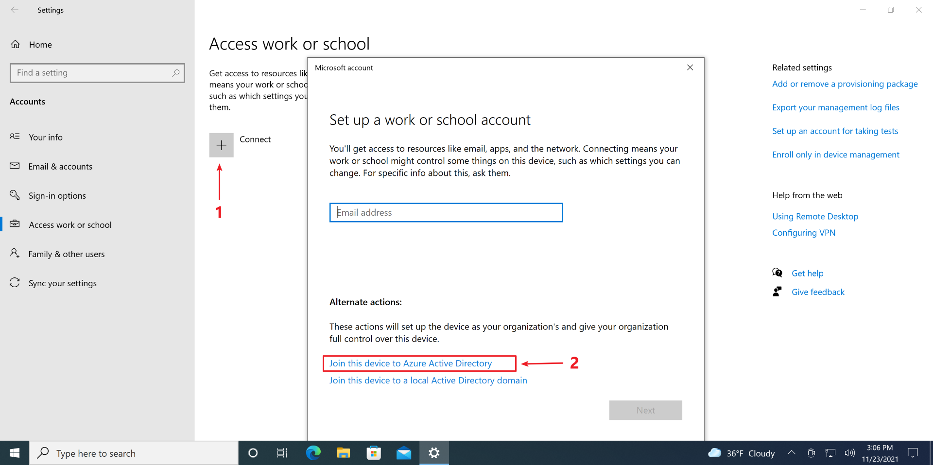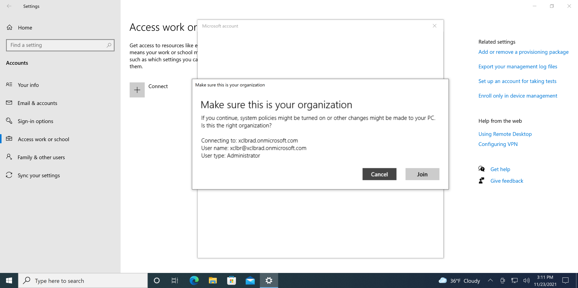 Now login to PC as Administrator, go to Settings → Accounts → Access work or school and click ➕ On dialog select Join this device to Azure Active Directory
