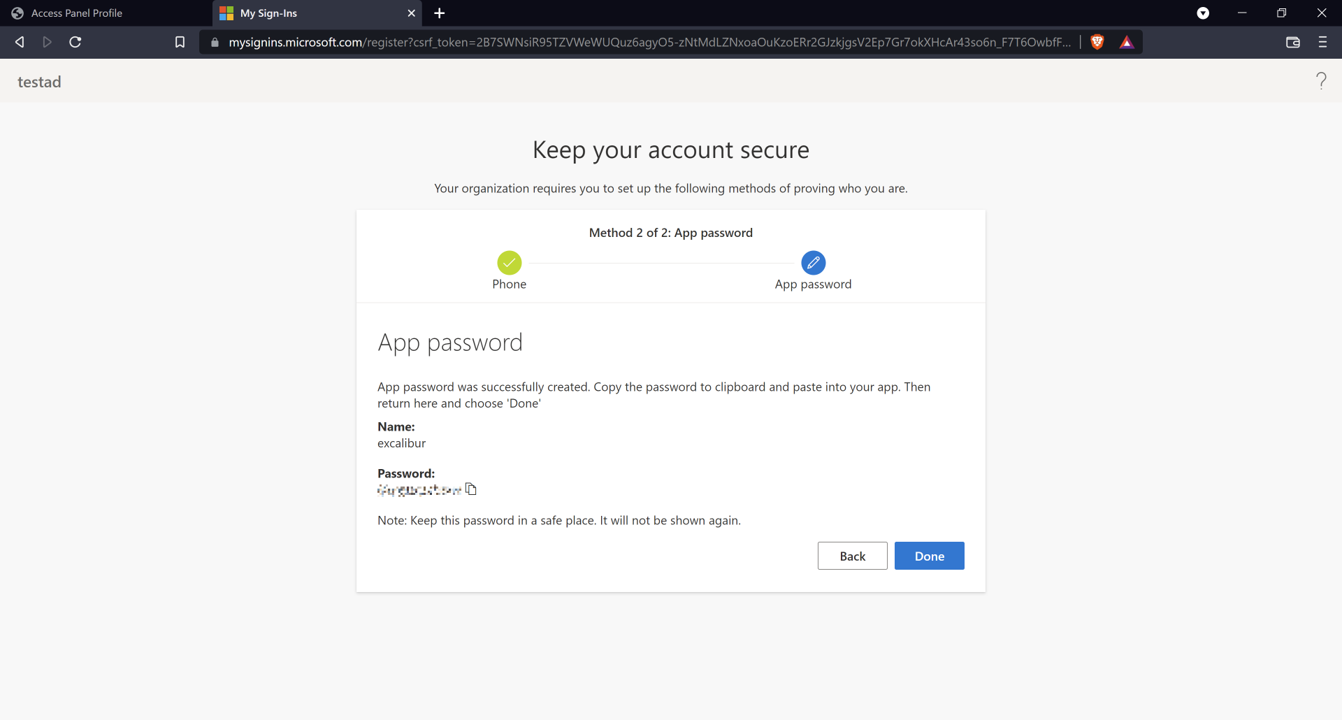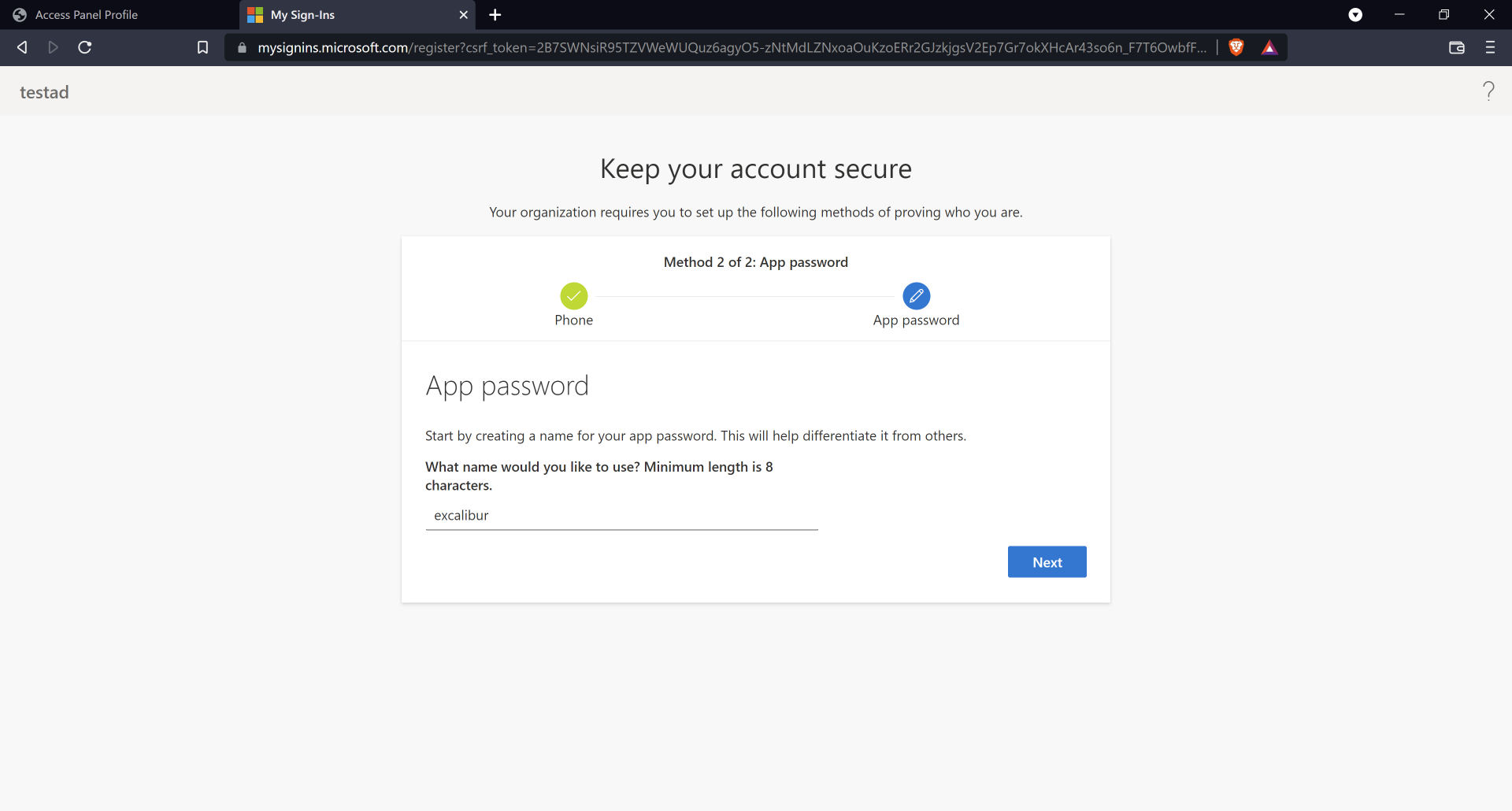 Create application password. Type app name. This step is optional, and depends on the setup of organization policy. Click Next