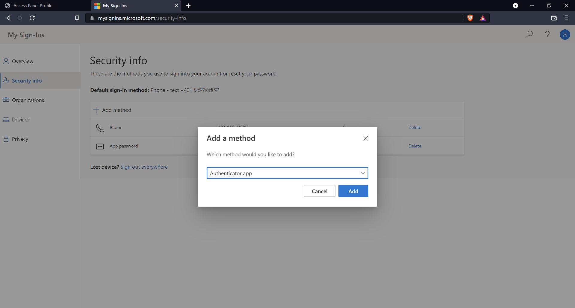 Now add a new Authentication method. Click Add method and select Authentication app from dropdown menu.