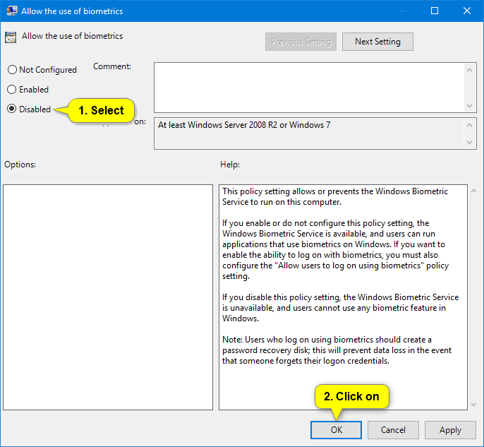 - To Disable Use of Windows Hello Biometrics, select (dot) Disabled, click/tap on OK.