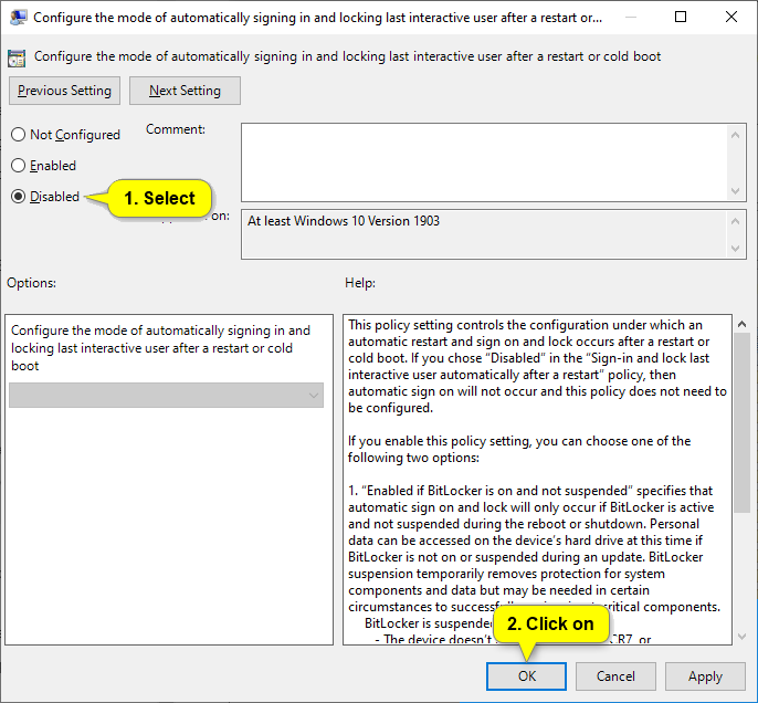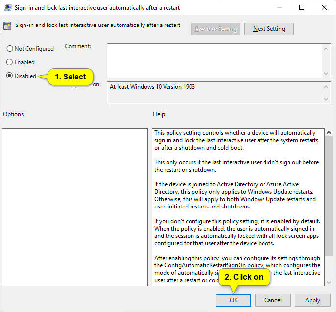 - To Disable Use of Autologon after update and reboot, select (dot) Disabled, click/tap on OK.