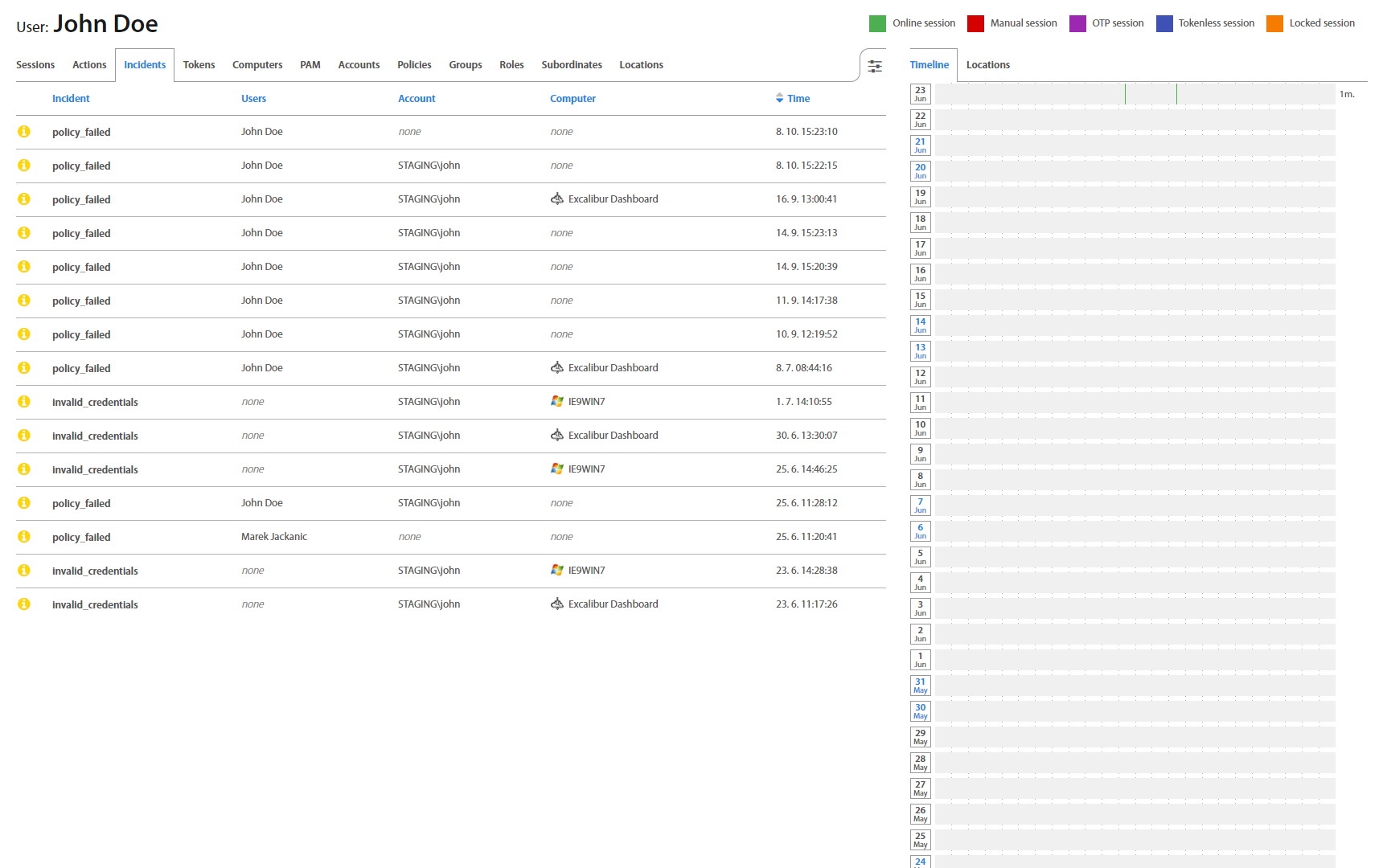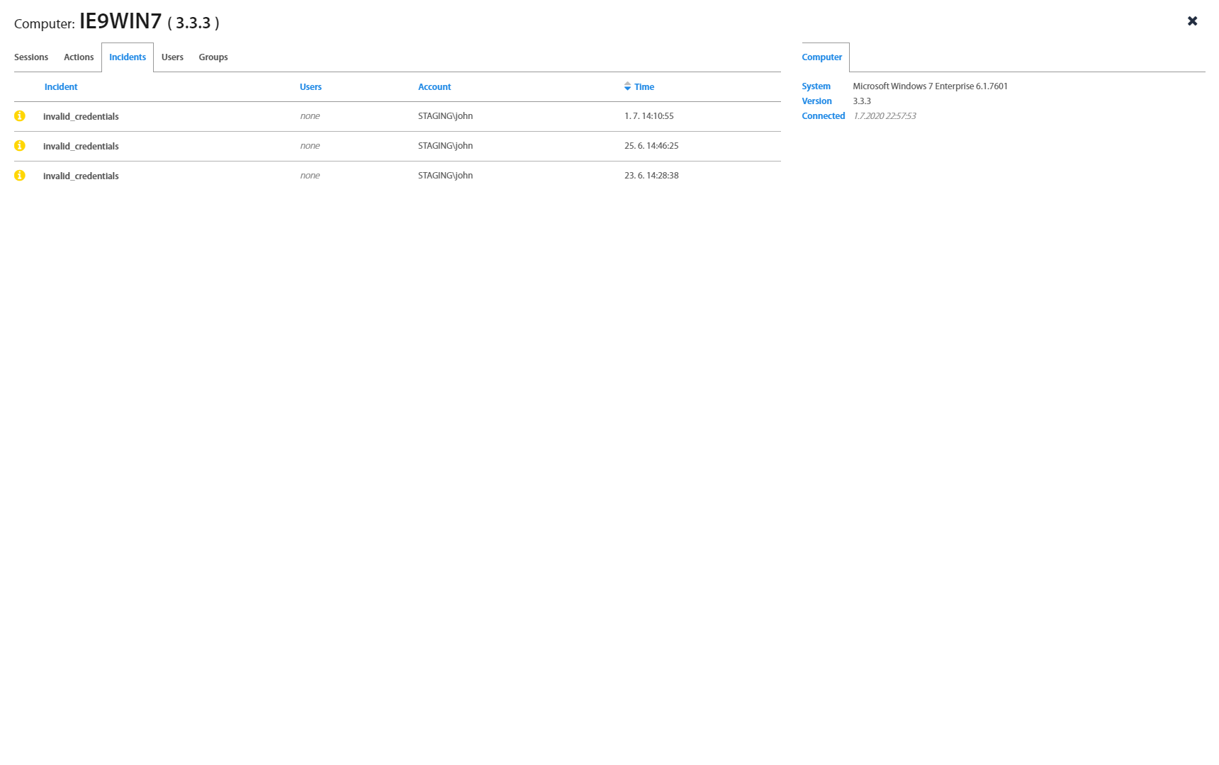 Karta Incidenty poskytuje prehľad všetkých bezpečnostných incidentov používateľa (ako napríklad neplatné poverenia) pre kontrolu. Kliknutím na jednotlivé riadky sa zobrazí detailná informácia o incidente s údajmi o incidente. Faktory, ktoré zlyhali, sú zobrazené červenou, takže používateľ môže zistiť, aký bol dôvod jeho neúspešnej akcie.