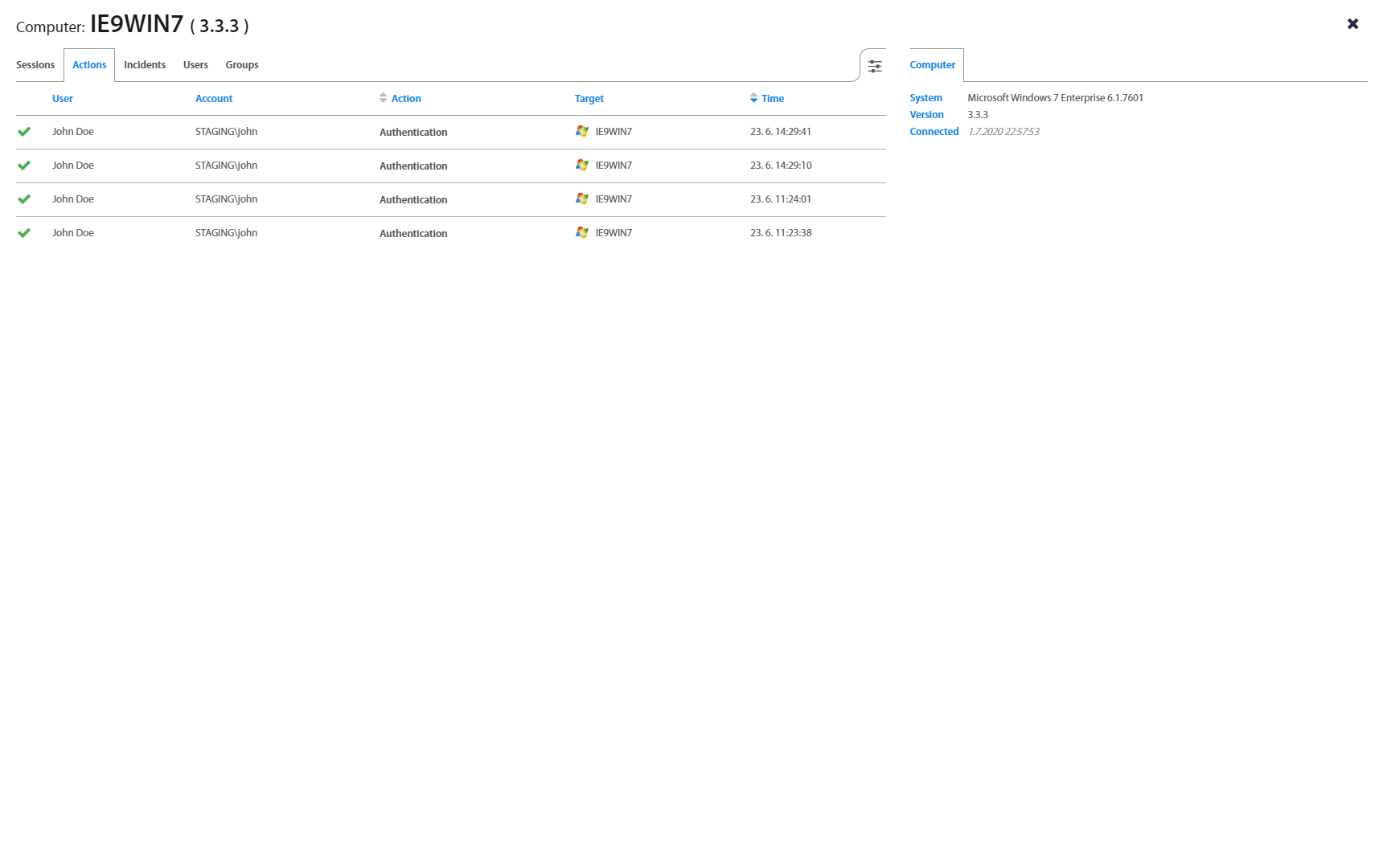 Zoznam všetkých vykonaných akcí požadovaných PAM zdrojom. Kliknutím na akciu sa zobrazia podrobnosti o akcii.