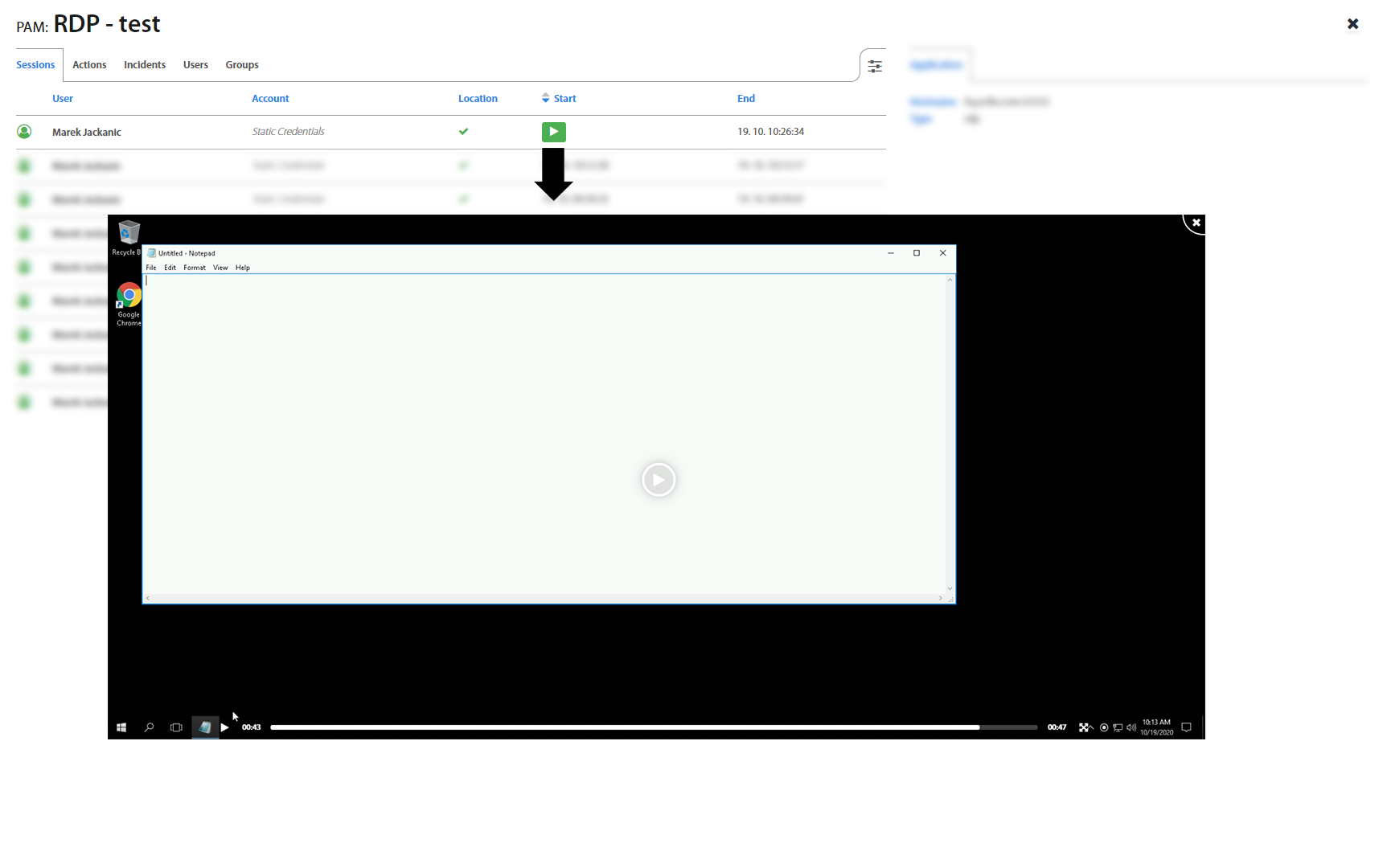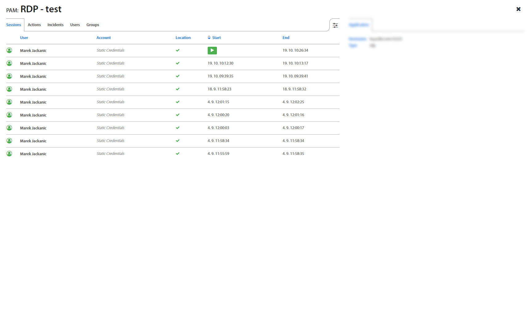 Na karte Relácie sú uvedené všetky minulé a aktívne relácie používateľa, ako aj ich začiatočný a konečný čas. Všetky relácie PAM sú predvolene zaznamenané. Umiestnením kurzora myši na zadanú reláciu sa zobrazí tlačidlo . Reláciu prehráte kliknutím na tlačidlo