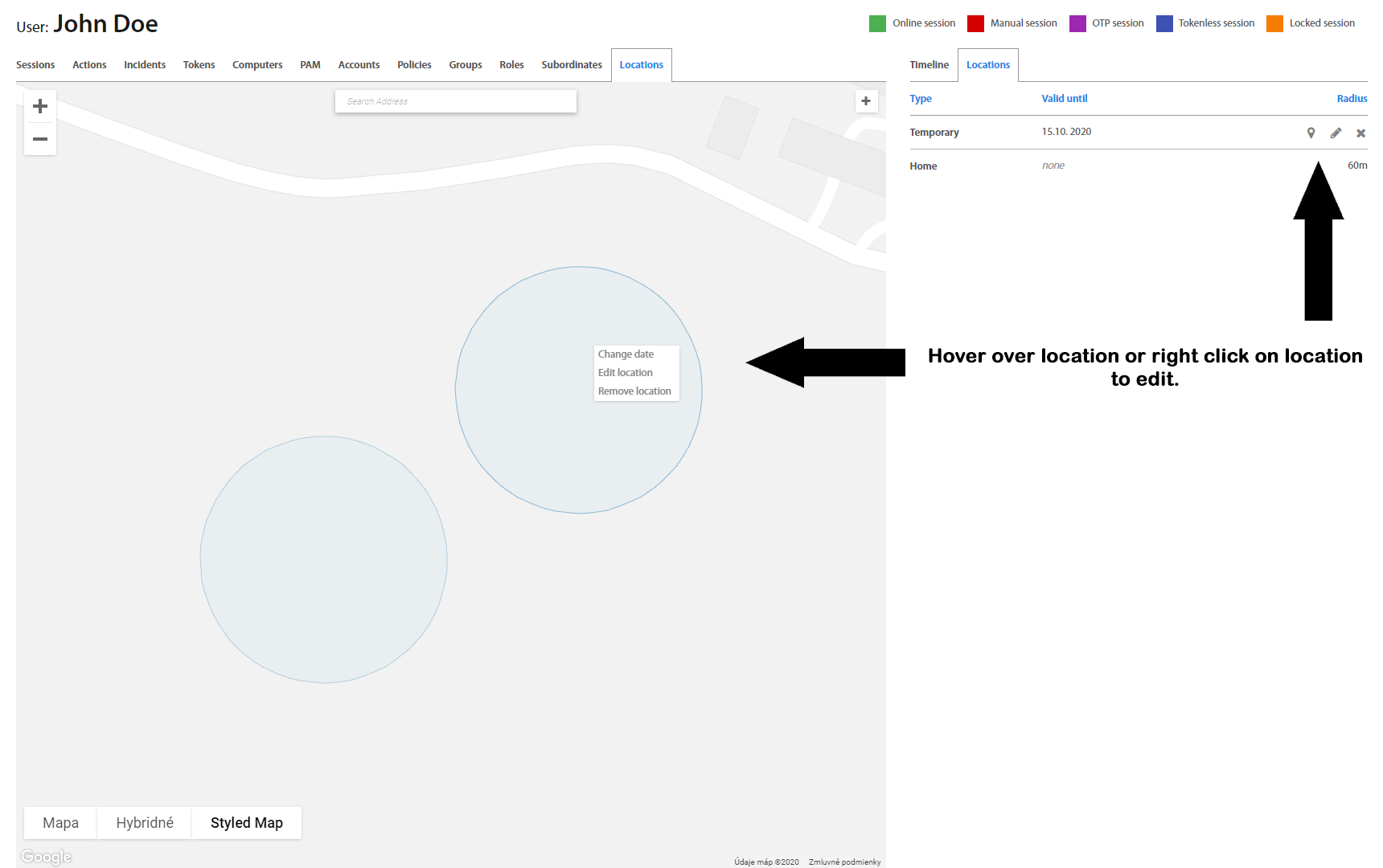 Lokality obsahujú zoznam všetkých umiestnení používateľa, odkiaľ sa s najväčšou pravdepodobnosťou prihlási do svojho počítača. Používateľ môže definovať rôzne polohy, ako je domov alebo dočasné poloha, taktiež dátum platnosti dočasnej polohy. Používateľ taktiež môže definovať domácu polohu z tokenu. Miesto môžete pridať kliknutím na tlačidlo "+" a umiestnením kruhu na požadované miesto na mape. Ak chce používateľ upraviť alebo odstrániť polohu, klikne na kruh pravým tlačidlom myši a vyberie požadovanú akciu. Používateľ môže zmeniť len polohu domovskej lokality. V dočasnej lokalite môže zmeniť dátum platnosti, polomer a polohu používateľa. Všetky nové nastavenia polohy musia byť autorizované tokenom. Používateľ autorizuje túto akciu potvrdením upozornenia push, ktoré je prijaté na token alebo ak používateľ stratí upozornenie push, oskenuje QR kód s tokenom.