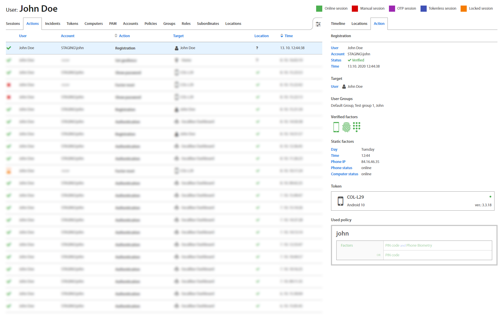 Karta Akcie zobrazuje všetky akcie, ktoré používateľ vykonal alebo v súčasnosti vykonáva, napríklad: Autentifikácia, Autorizácia, Verifikácia, Registrácia a Obnovenie faktorov. Kliknutím na jednotlivé riadky sa zobrazí podrobná informácia o akcii s overenými faktormi, a taktiež pravidlá pre vykonanie danej akcie s použitím tokenu.