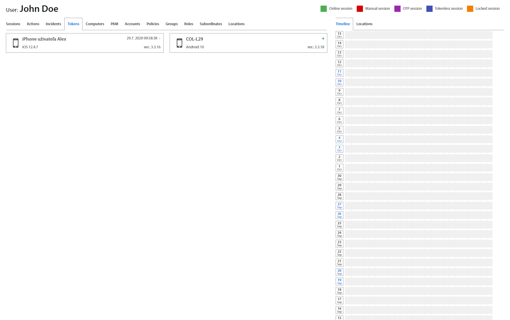 Karta Tokeny zobrazuje všetky registrované tokeny ktoré má používateľ. Farebný bod vedľa mena zariadenia reprezentuje online / offline stav zariadenia, pod ním sa nachádza verzia mobilnej aplikácie.
