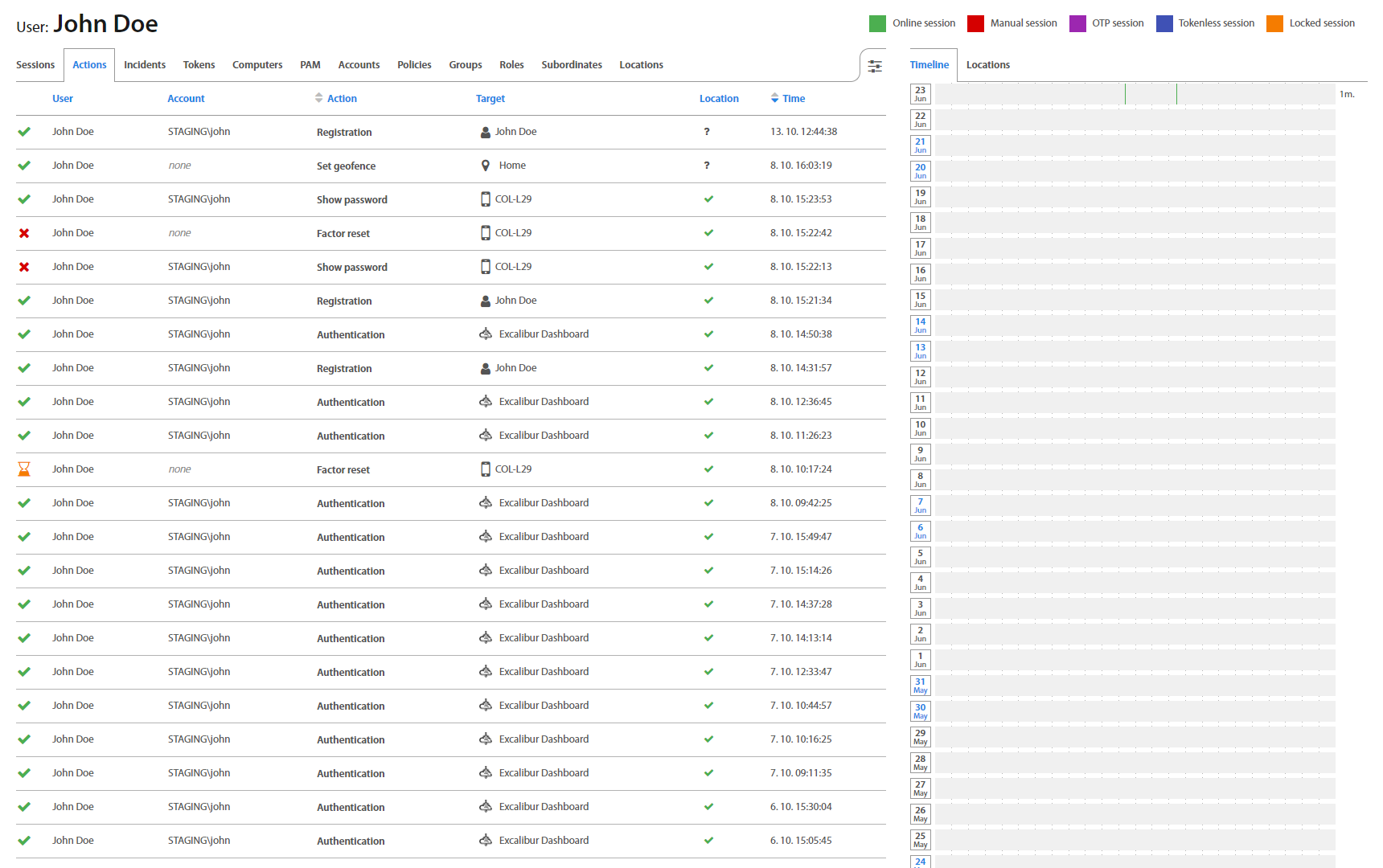 User - Používateľ je osoba, koncový používateľ ktorá používa Excalibur k Autentifikácii a Autorizácii PC klientov a jeho súčastí, použitím svojho osobného tokenu, a ak je to možné, manažovať svoje relácie na danom klientovi. Používateľ taktiež môže overovať svojich kolegov (ak je to povolené a požadované), resetovať vlastné faktory overenia, rovnako ako aj heslo ak expirovalo (alebo ak je to požadované). Každý používateľ sa taktiež môže prihlásiť do informačného panela, kde bežný používateľ vidí iba vlastné akcie a relácie, PAM zdroje, registrované tokeny a počítače. Na základe bezpečnostnej politiky si môže používateľ vytvoriť vlastné domáce a dočasné lokality. V prípade, že používateľ má priradených podriadených, potom má používateľ automaticky priradenú rolu manažéra. Manažér má v Dashboarde viac funkcií ako používateľ a môže controlovať účty a aktivity podriadených, ako aj overovať podriadených z Dashboardu. Pre viac informácií o rolách si prečítajte: Excalibur Enterprise Roles Description