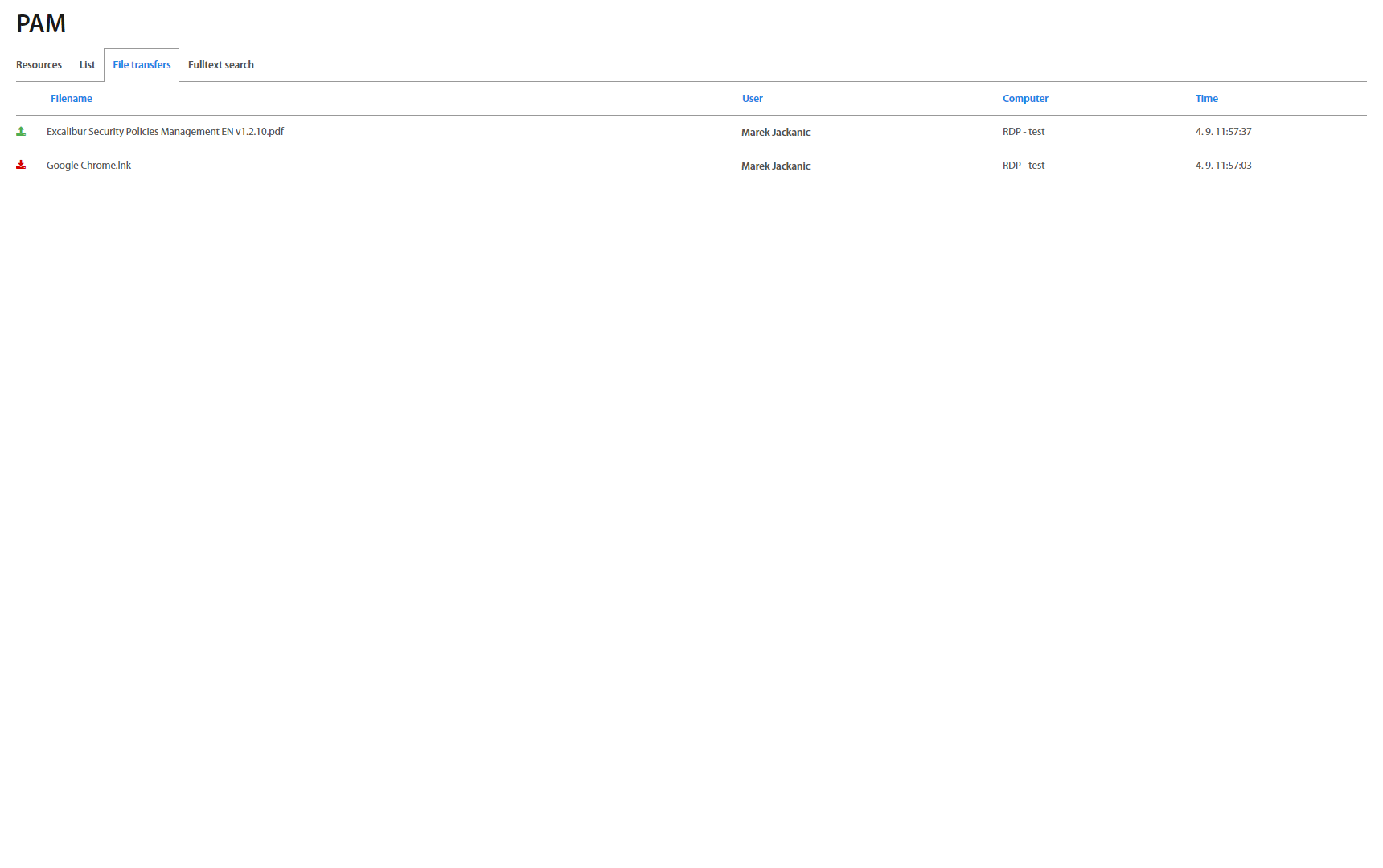Excalibur PAM zobrazuje všetky prenesené súbory používateľom v reláciách PAM. Každá rola má prednastavené pravidlá na zobrazovanie prenesených súborov. Používatelia majú prístup iba k svojim vlastným súborom. Kliknutím na konkrétny súbor alebo na tlačidlo , sa súbor okamžite stiahne. Kliknutím na meno používateľa alebo klienta sa zobrazia ďalšie informácie.
