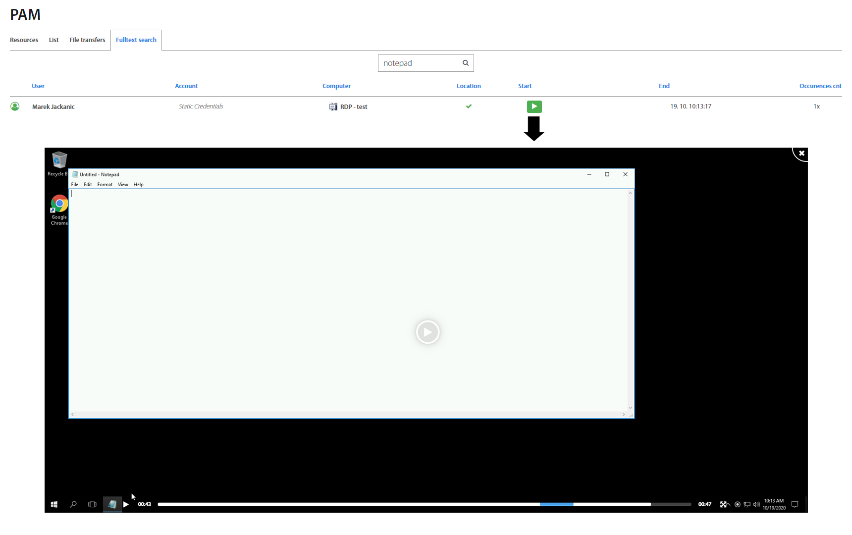 Excalibur PAM umožňuje nájsť celé slovo, ktoré je vložené používateľom počas relácie PAM. Každá rola má vopred určené pravidlá vyhľadávania. Používatelia môžu vyhľadávať iba vo vlastných reláciách. Do vyhľadávacieho panela zadajte požadované slovo a relácie s požadovaným slovom sa zobrazia okamžite. Umiestnite kurzor myši nad požadovanú reláciu a kliknite na tlačidlo , aby ste spustili požadovanú reláciu.