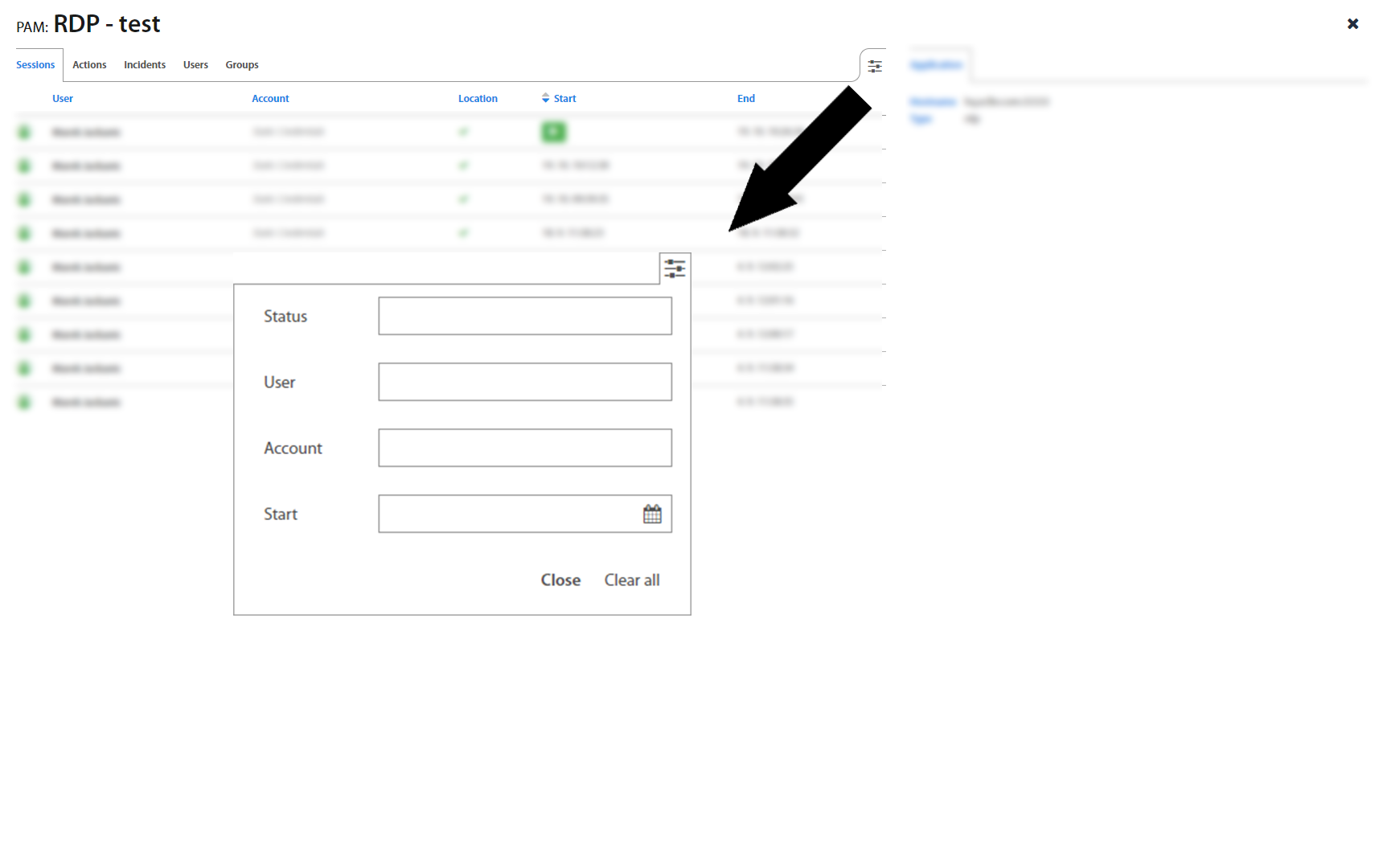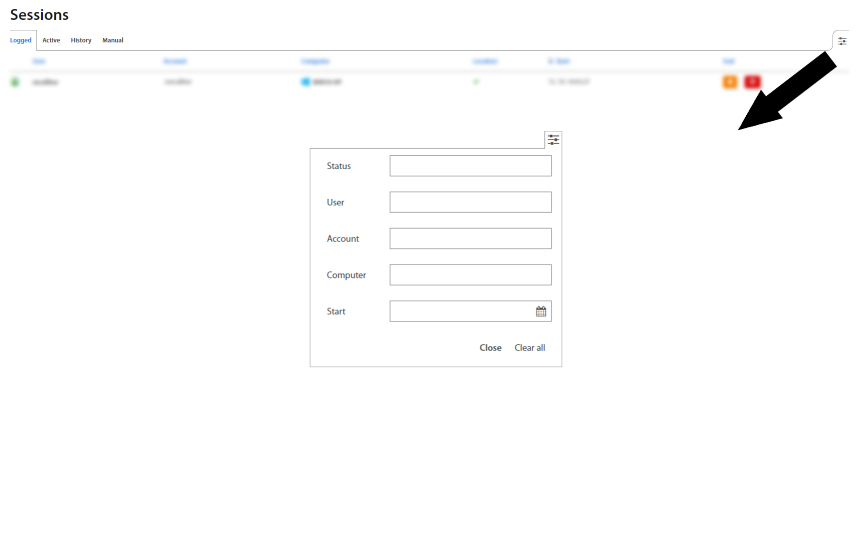 V pravom hornom rohu je tiež možné filtrovať relácie podľa účtu, počítača, stavu alebo času začiatku.