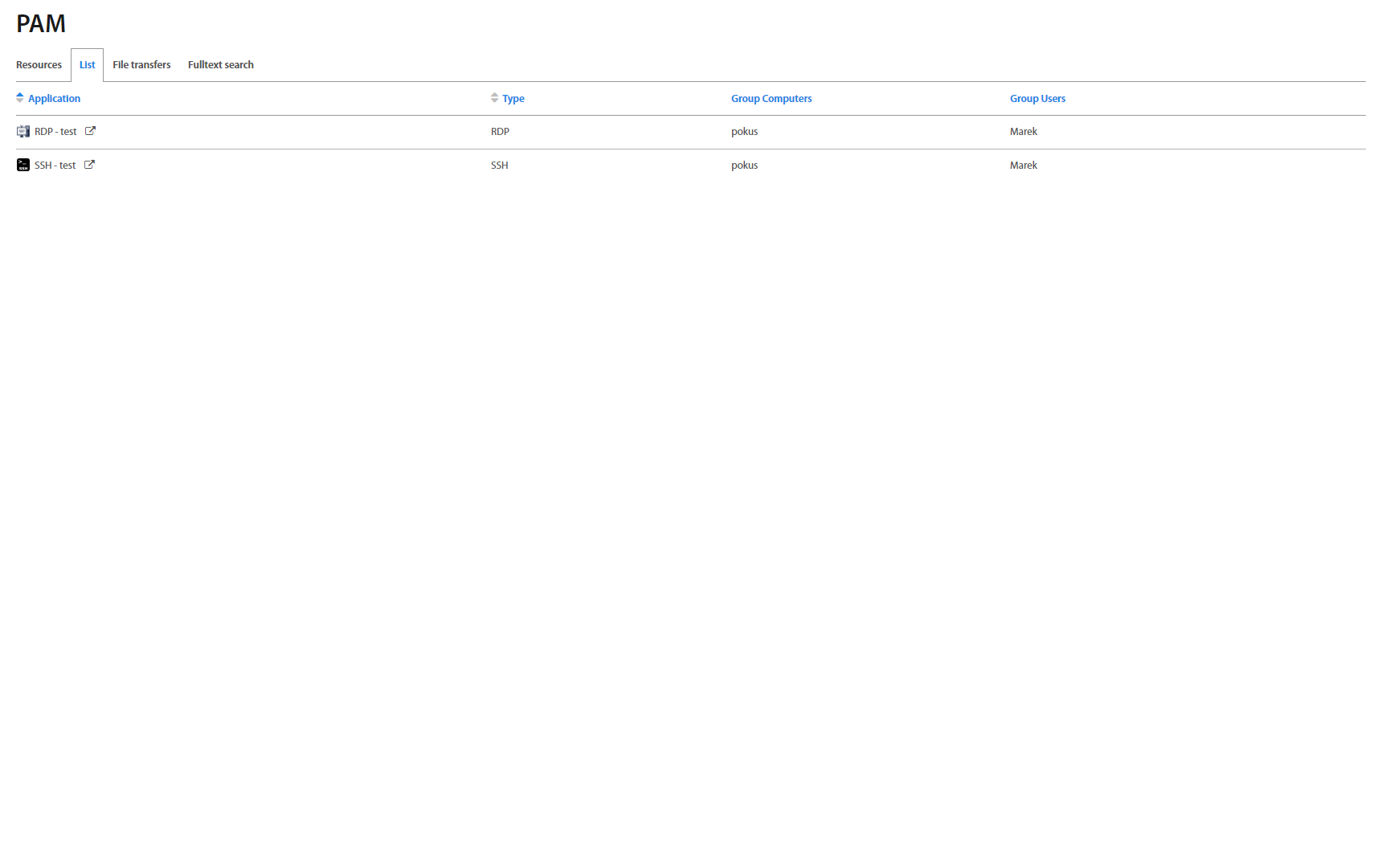 Záložka PAM obsahuje všetky zdroje PAM, ktoré sú priradené užívateľovi, a popisuje typ PAM, skupinu, kde je priradený zdroj PAM a skupiny používateľov, kde je priradený zdroj PAM. Kliknutím na ikonu alebo názov zdroja PAM sa zobrazia podrobnosti o zdroji PAM. Kliknutím na tlačidlo sa otvorí zdroj PAM.