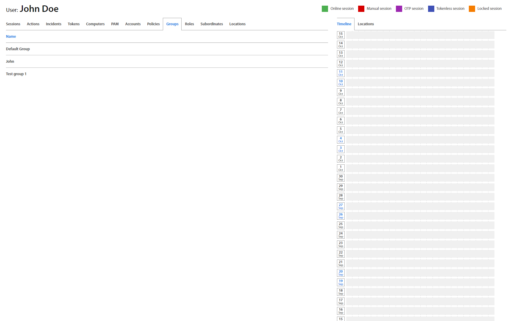 Na karte Používatelia sú uvedené všetky podrobnosti používateľa, ktorí používajú aplikáciu PAM. Kliknutím na používateľa sa zobrazia jeho podrobnosti. Kliknutím na token sa zobrazia jeho podrobnosti. Kliknutím na účet sa zobrazia podrobnosti o účte. Ak je relácia PAM aktívna, potom stĺpec relácií zobrazuje trvanie relácie.