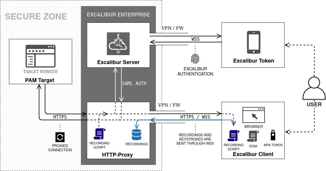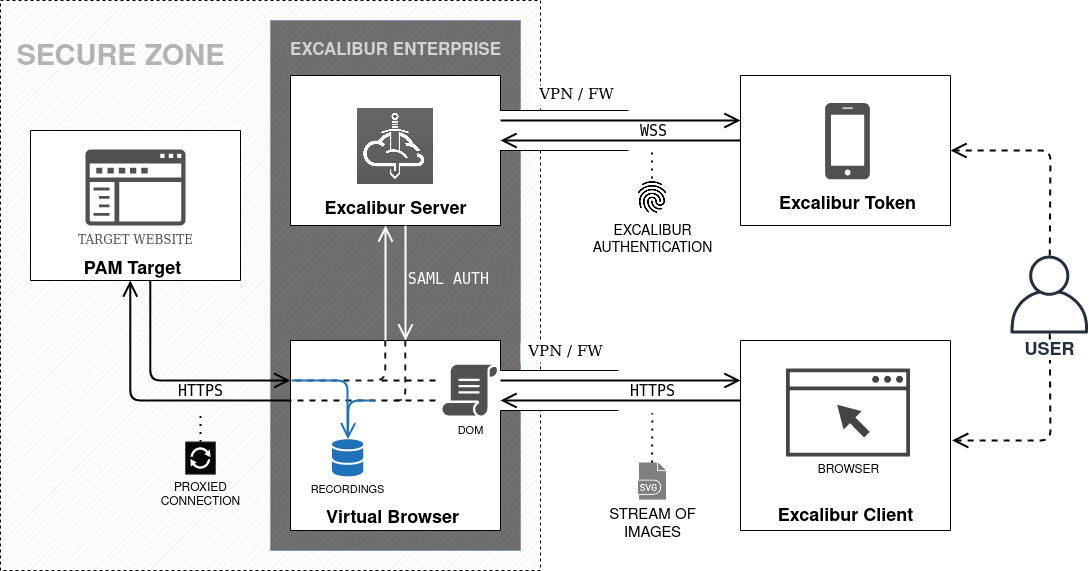 Access to PAM protected resources (such as HTTP-Proxy or Virtual Browser protected resources) is granted only on a whitelisted basis and only to strongly multi-factor authenticated users. Excalibur is installed to the existing customer architecture, typically in the secure zone as shown on figures in this document, but it can also be installed in a separate network segment, when network access to every protected resource is allowed.