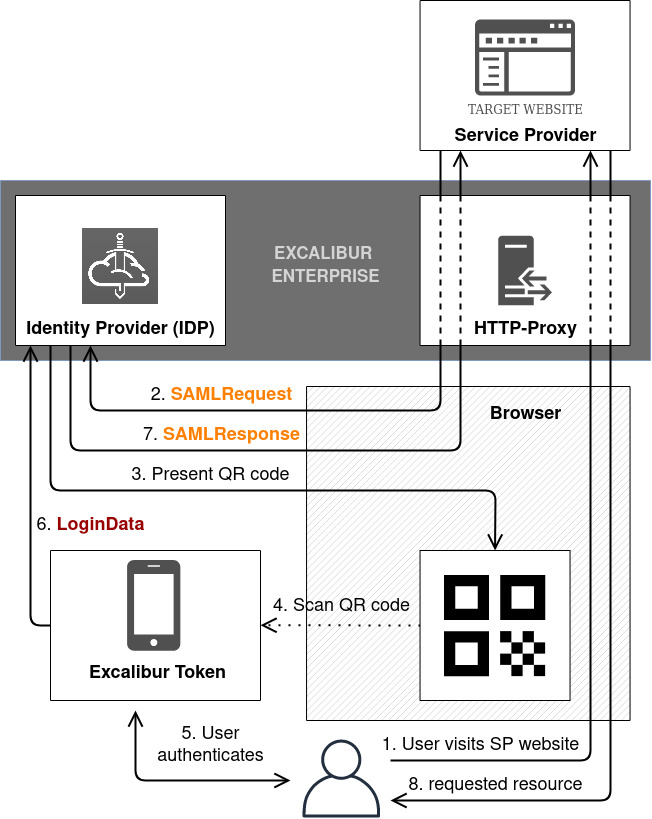 - Excalibur Server (IDP) redirects user back to the same HTTP-Proxy session. This message also contains SAMLResponse, which will be proxied to the service provider.