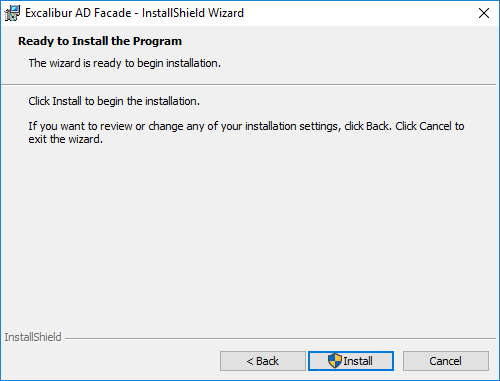 Excalibur AD Facade is shipped as signed Windows installer package (*.msi), which is preconfigured for each company. When installing Excalibur AD Facade installer package must be run under account with elevated privileges (domain Administrator) and on a computer, that is domain joined.