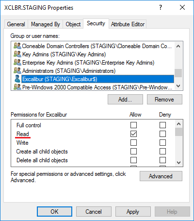 Click on the “Apply” button then click “OK”. Created gMSA will now have sufficient rights for Excalibur AD Facade to work properly.