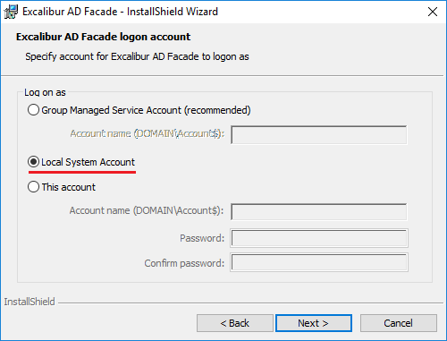 Excalibur AD Facade can be installed with Local System account as its log on account only on AD DC. On any other computer that is not DC, Local System account does not have sufficient privileges within domain for Excalibur AD Facade to work properly.