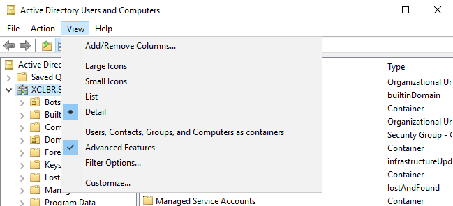 To configure these permissions for gMSA, open Active Directory Users and Computers administrative tool on AD DC. After launch, make sure “Advanced Features” under “View” menu is checked for advanced features became available during configuration.