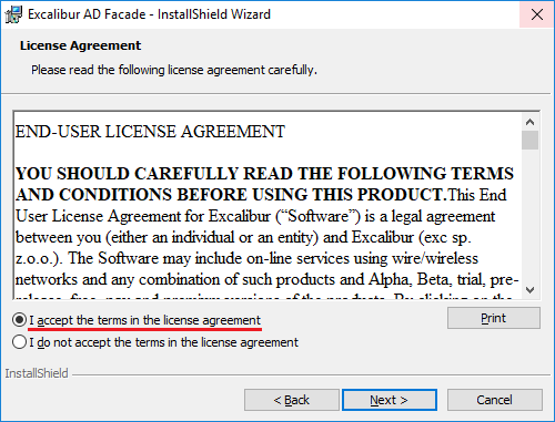After running Excalibur AD Facade installer package on target machine, familiar dialog will pop-up. Simply proceed to the next step by clicking on the “Next” button.