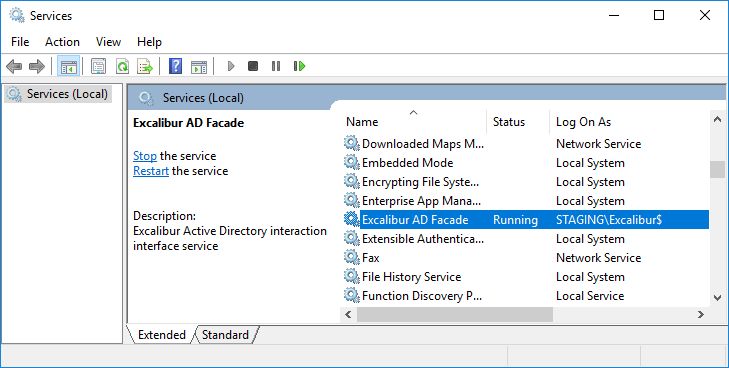 - In case Excalibur AD Facade service will logon as domain account, credentials to that account must be entered during installation and provided to Service Control Manager (SCM). Even though SCM holds password stored in a secure portion of the registry for normal domain account, it is nevertheless subject to attack.