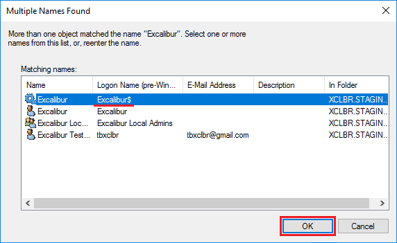 Just make sure to select one with a dollar sign suffixed Logon Name and click on the “OK” button.