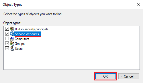 In dialog “Object Types” make sure “Service Accounts” is checked. And confirm with the “OK” button. This will ensure that in the next step checking names will search specified account name in service accounts as well.