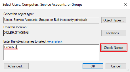 Next, write the name of the created gMSA into “Enter the object names to select” field (in this manual we created gMSA with name “Excalibur”) and click on “Check Names” button.