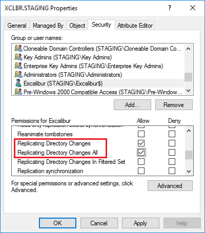 Scroll permissions list down and check allow on “Replicating Directory Changes” and “Replicating Directory Changes All” permissions as well.