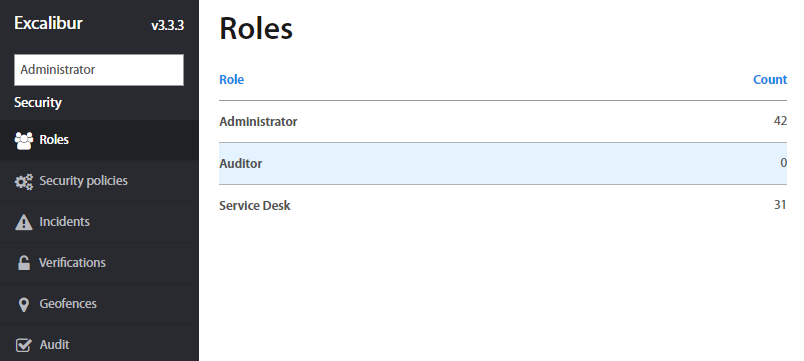 Some companies can require a role for a person who will control the settings of Excalibur. For this case is the Auditor role in Excalibur. This person has access to Excalibur Dashboard like as Administrator but the Auditor can't execute changes of settings. Auditor sees locatiom fromwhere the user executes action