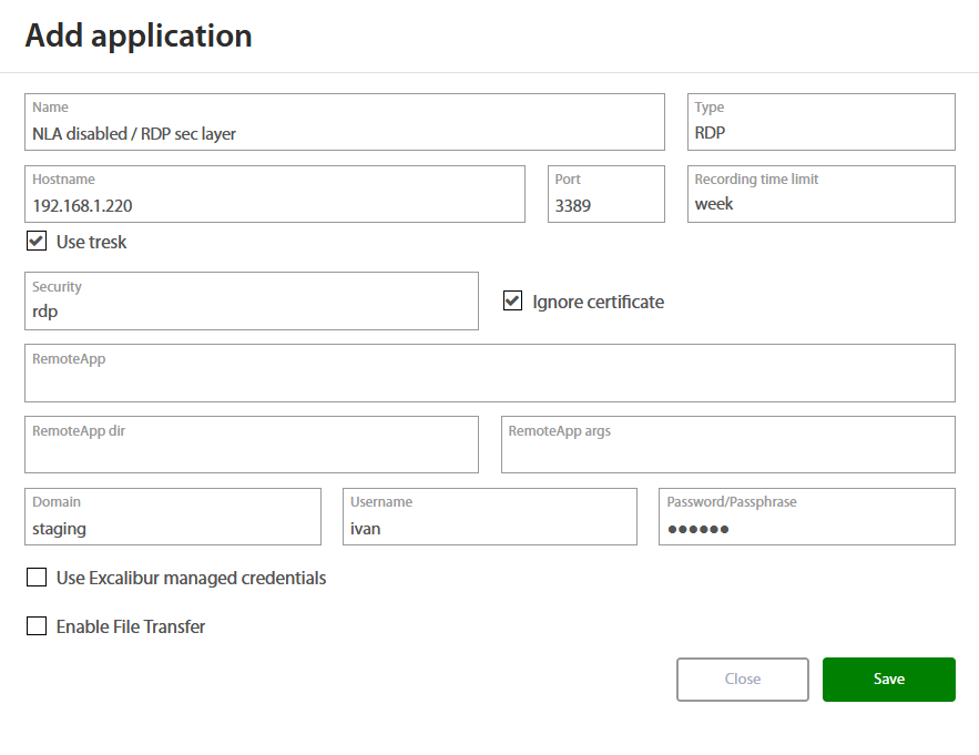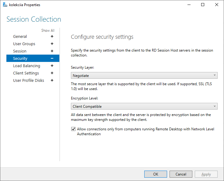 Note that RemoteApp will not work on the RDP security layer! This is a limitation of Terminal Server not Excalibur.