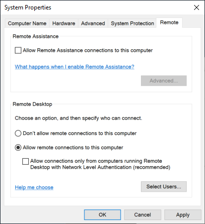 If both NLA and TLS security layers are disabled, such as in this configuration: