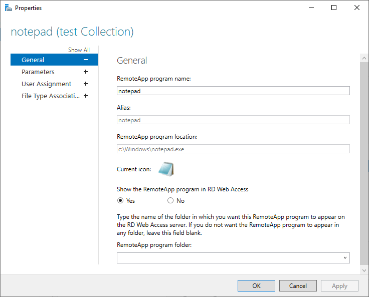 Notice there is no extension like notepad.exe - just notepad - exactly as in the RemoteApp settings program name.