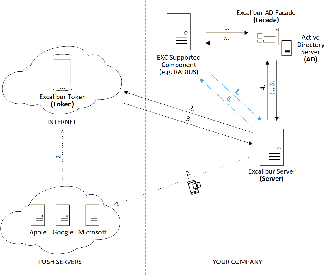 Every Excalibur Authorization is push notification based, for example, VPN-login where username needs to be entered will trigger a push notification to the Token of the User specified by the username. On the Token, the User is asked to confirm the given action with the exact specification of what is being confirmed and authentication factors are requested. RADIUS is the primary use case of Excalibur Authorization. In these cases, no password is reconstructed as no password is required.