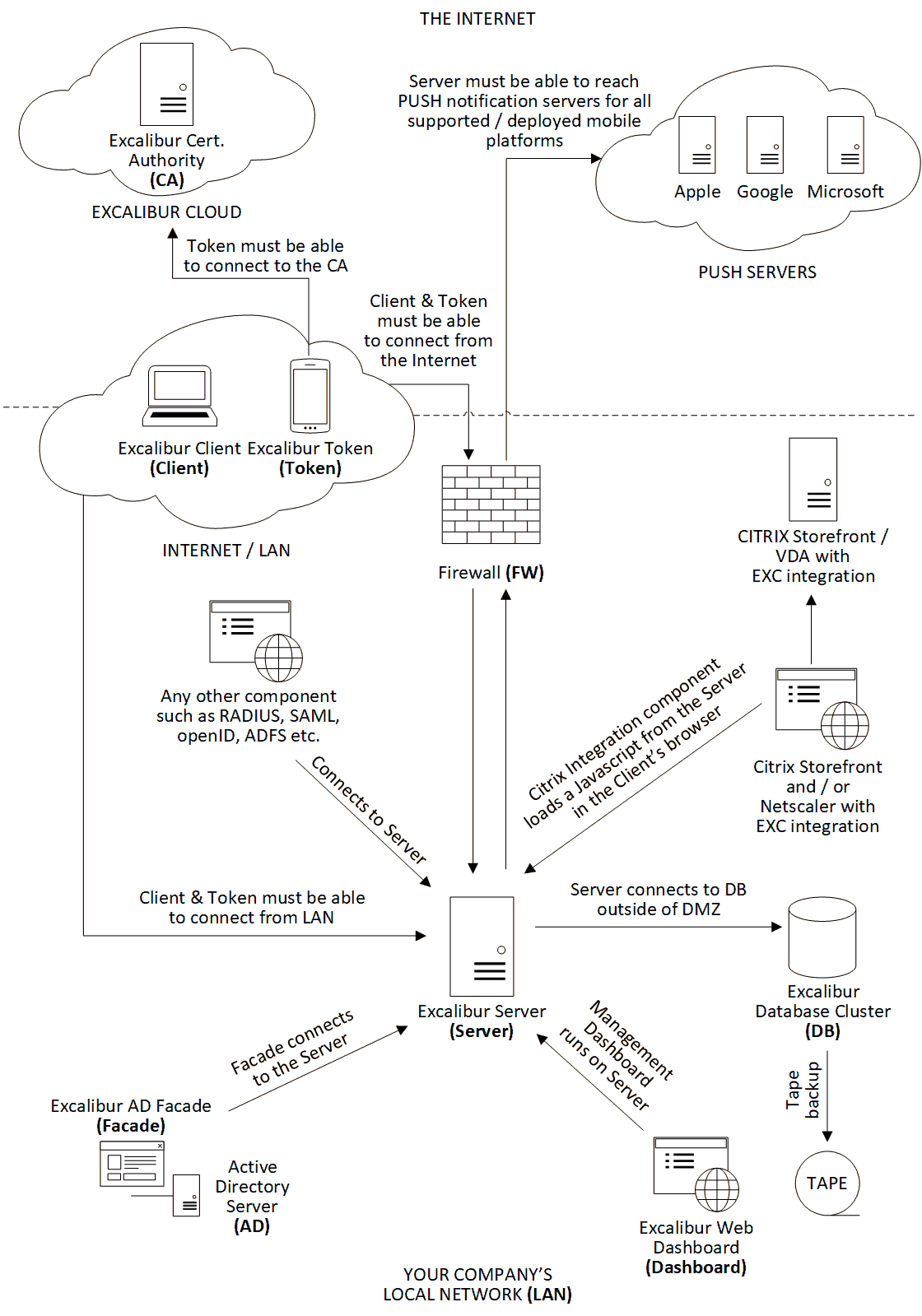 Excalibur connects to push notification servers to send push notifications to registered Tokens. Firewall must be configured to allow this Excalibur Server outgoing communication.